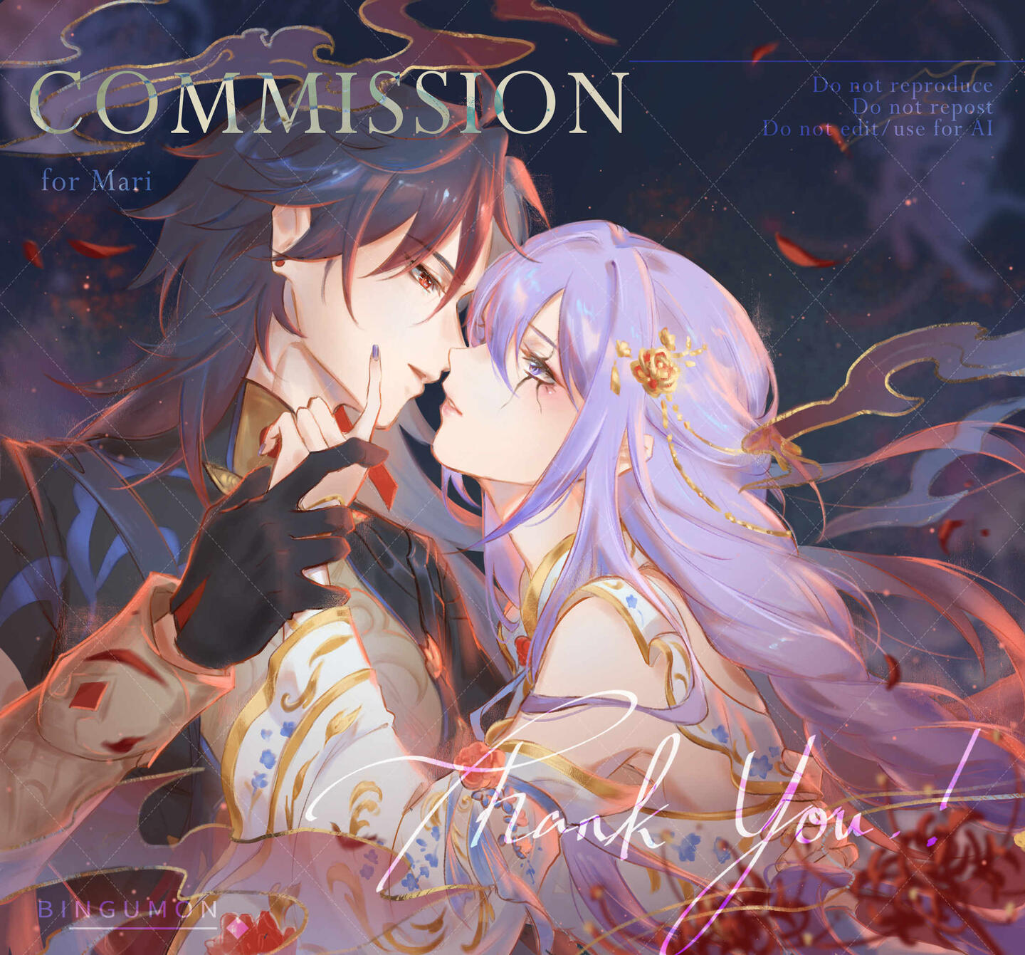 Commissioned pieces are not allowed to be used in any blockchain-related technology (NFTs, cryptocurrency, etc.) & AI